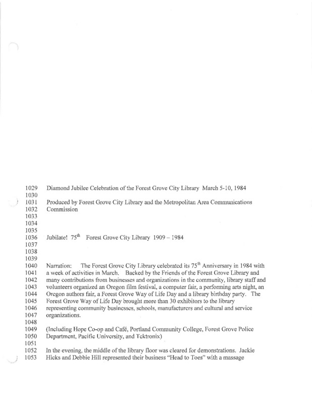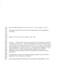 A video recording of Forest Grove City Library's 75th anniversary celebration. Video includes speeches by several community members. Each one focuses on a different aspect of the library, its past, present, and future. As well as a speech about the role of the Women's Club in the library. There is a transcript of this video.
