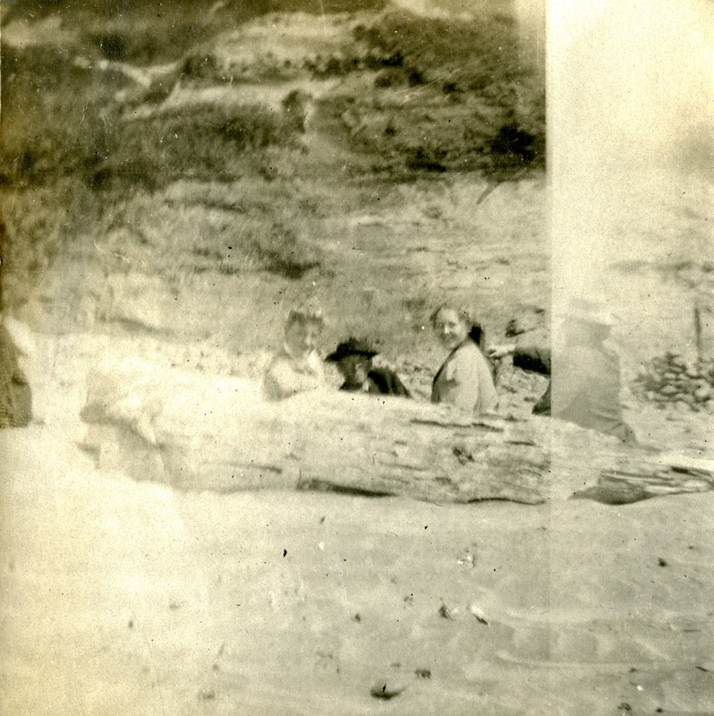 Two women and two men sit against a log in the sand, probably on a beach in Oregon. This photograph was found in an album labelled "Photones", which is part of the Charles Lovell and Winnette Sears Walker Collection. Winnette was a 1906 alumna of Linfield College. Charles was an alumnus of Tualatin Academy who later became a musician and an insurance agent in Hillsboro, Oregon.