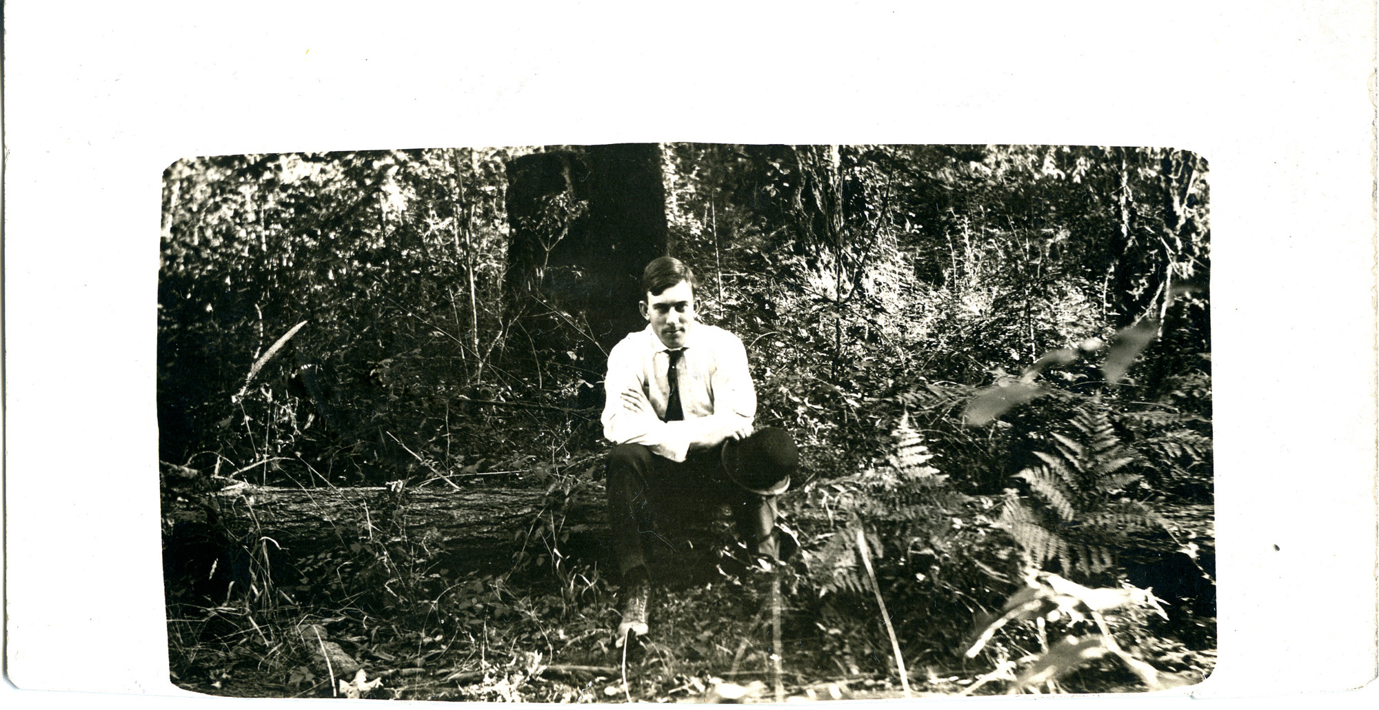 A man, who holds a hat, sits on a log in a forest, probably in Northwestern Oregon.The picture was sent to "Miss Winnett Sears", postmarked May 5, 1909. This photograph is part of the Charles Lovell and Winnette Sears Walker Collection. Winnette was a 1906 alumna of Linfield College. Charles was an alumnus of Tualatin Academy who later became a musician and an insurance agent in Hillsboro, Oregon.