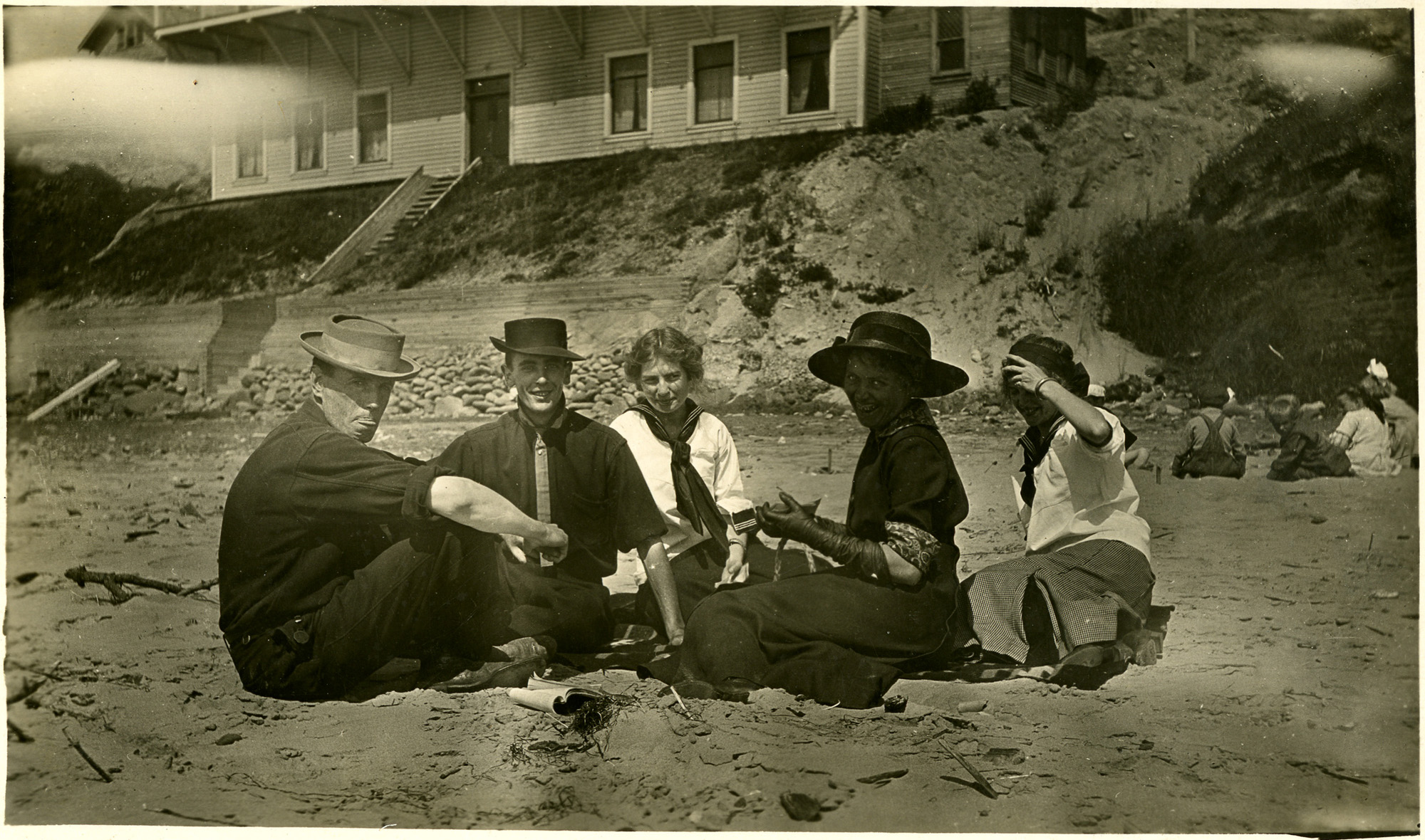 Two men and three women pose at Nye Beach in Oregon, next to the Nicolai Hotel, which was built in 1912. The man on the left may be Charles Walker. The woman second from the right is Winnette Sears. The others are unidentified. This photograph is part of the Charles Lovell and Winnette Sears Walker Collection. Winnette was a 1906 alumna of Linfield College. Charles was an alumnus of Tualatin Academy who later became a musician and an insurance agent in Hillsboro, Oregon.