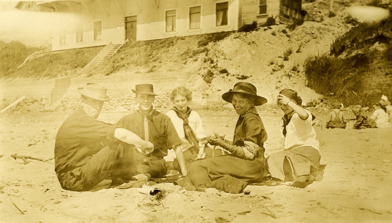 Two men and three women pose at Nye Beach in Oregon, next to the Nicolai Hotel, which was built in 1912. The man on the left may be Charles Walker. The woman second from the right may be Winnette Sears. The others are unidentified. This photograph is part of the Charles Lovell and Winnette Sears Walker Collection. Winnette was a 1906 alumna of Linfield College. Charles was an alumnus of Tualatin Academy who later became a musician and an insurance agent in Hillsboro, Oregon.