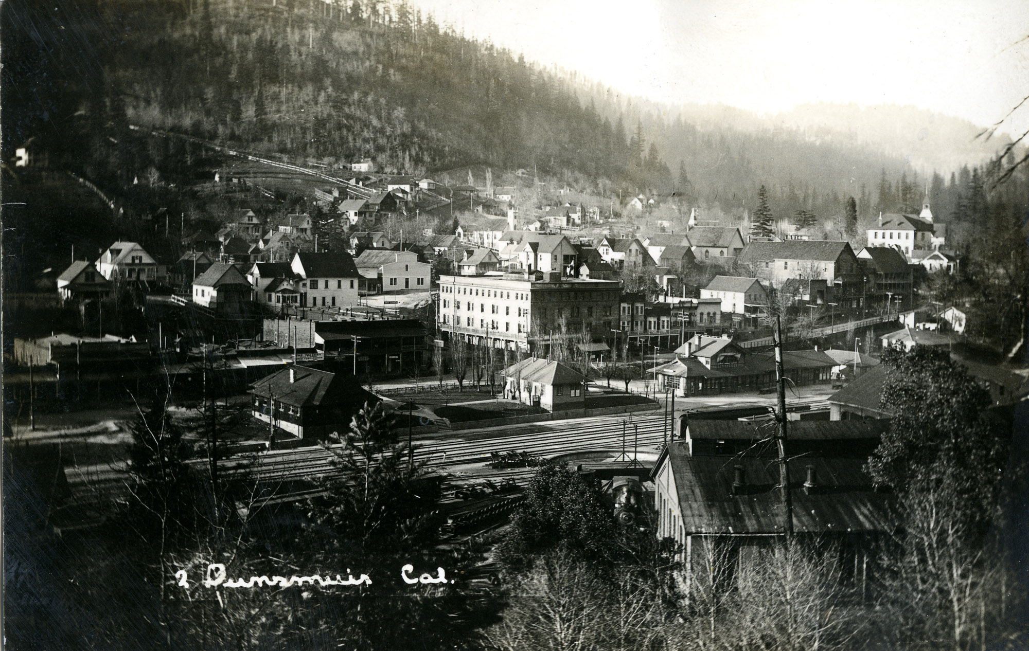 A photograph of Dunsmuir, California. It is printed on postcard stock and includes a brief note to Mr F. A. Logan. This photograph is part of the Charles Lovell and Winnette Sears Walker Collection. Winnette was a 1906 alumna of Linfield College. Charles was an alumnus of Tualatin Academy who later became a musician and an insurance agent in Hillsboro, Oregon.