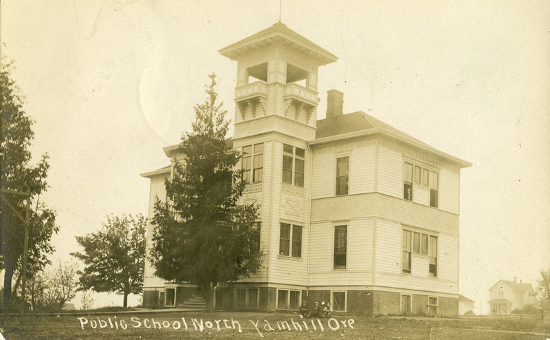 A photograph of a public school in North Yamhill, Oregon. This photograph is printed on postcard stock and includes a brief note from "Freda" to "Miss Winnette Sears". It is postmarked November 10, 1910. This photograph is part of the Charles Lovell and Winnette Sears Walker Collection. Winnette was a 1906 alumna of Linfield College. Charles was an alumnus of Tualatin Academy who later became a musician and an insurance agent in Hillsboro, Oregon.