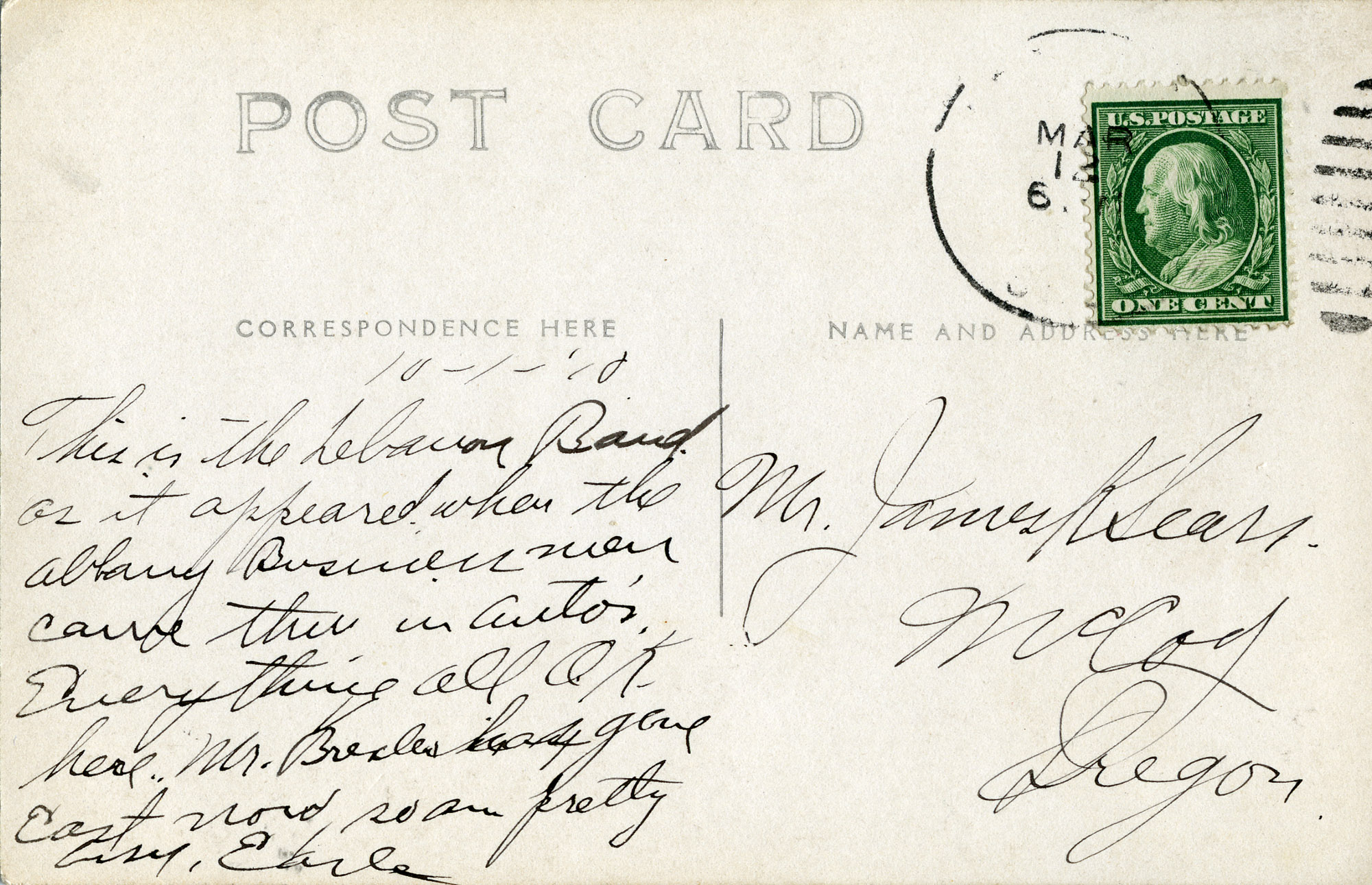 A photograph of the Lebanon Peerless Band on Main Street in Lebanon, Oregon. This photograph is printed on postcard stock and includes a note from "Earle" to "Mr. James K Sears". Earle is likely Walter Earle Sears, James K. Sears' son. This photograph is part of the Charles Lovell and Winnette Sears Walker Collection. Winnette was a 1906 alumna of Linfield College. Charles was an alumnus of Tualatin Academy who later became a musician and an insurance agent in Hillsboro, Oregon.