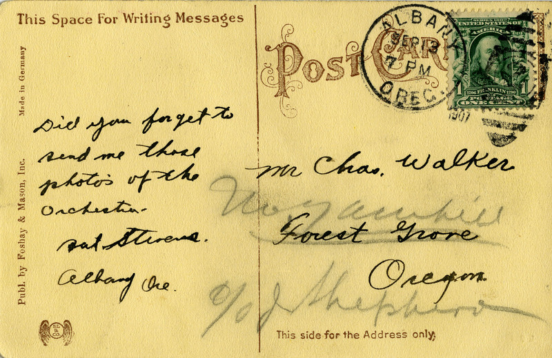 A postcard depicting a Catholic Church in Albany, Oregon. It includes a brief note inquiring about some photographs and was sent to "Mr Chas. Walker". It is postmarked September 13, 1907. This postcard is part of the Charles Lovell and Winnette Sears Walker Collection. Winnette was a 1906 alumna of Linfield College. Charles was an alumnus of Tualatin Academy who later became a musician and an insurance agent in Hillsboro, Oregon.