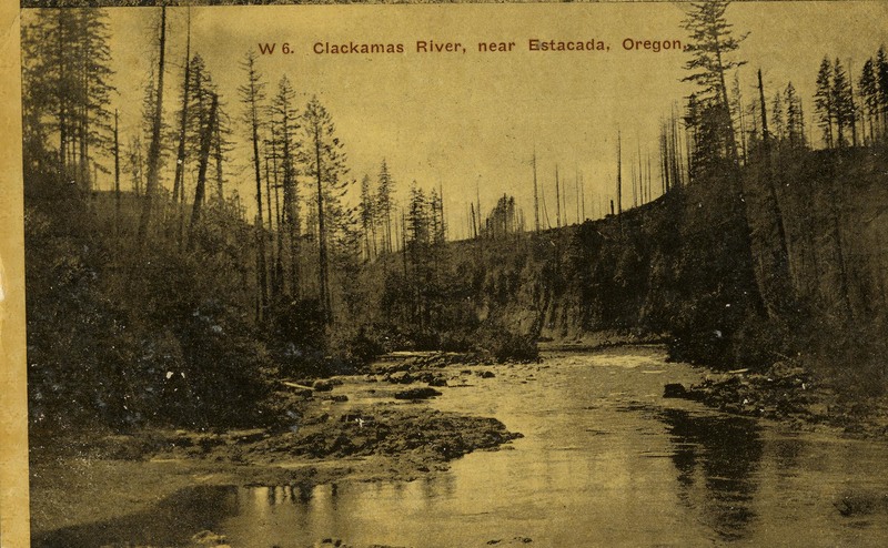 A postcard depicting the Clackamas River near Estacada, Oregon. It includes a brief note from "Eva" to "Mr. Chas. Walker" and is postmarked July 23, 1908. This postcard is part of the Charles Lovell and Winnette Sears Walker Collection. Winnette was a 1906 alumna of Linfield College. Charles was an alumnus of Tualatin Academy who later became a musician and an insurance agent in Hillsboro, Oregon.