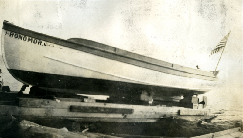A black and white photograph of a wooden boat named "Ronomor" being launched into the water from a dock. The name appears to be based on the phrase "Row No More," probably referring the fact that the boat had a motor. This photograph was probably taken on the Oregon Coast circa 1910-1920.