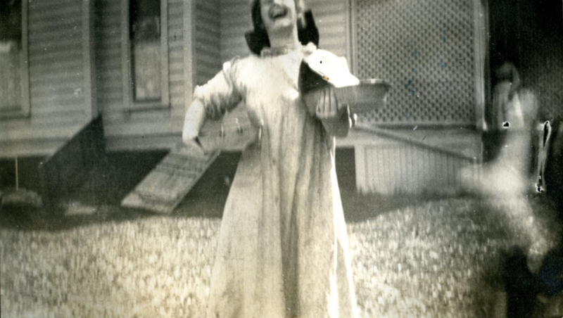 - A black and white photograph of a young woman laughing. She is holding two baking pans. This photograph is part of the Nettie Shipley Haines photograph album.