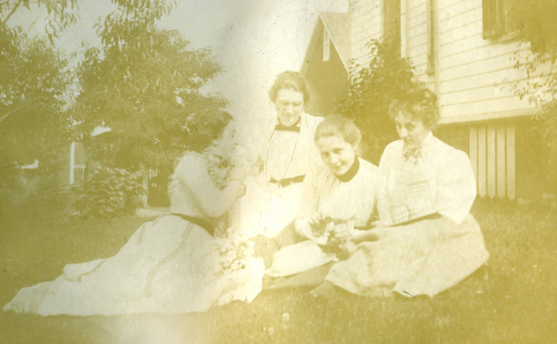 - A sepia photograph of four women sitting on grass next to a house. This photograph is part of the Nettie Shipley Haines photograph album.
