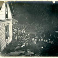 A black and white photograph of a band playing on the lawn of a large home, probably in Forest Grove, Oregon. The band members, who are all male, are wearing military-style uniforms. They resemble the uniforms worn by the Chemawa Indian School band, but it is unclear if this is that group. The band and spectators are seated on wooden walkways. This photograph likely dates to between 1900-1919.