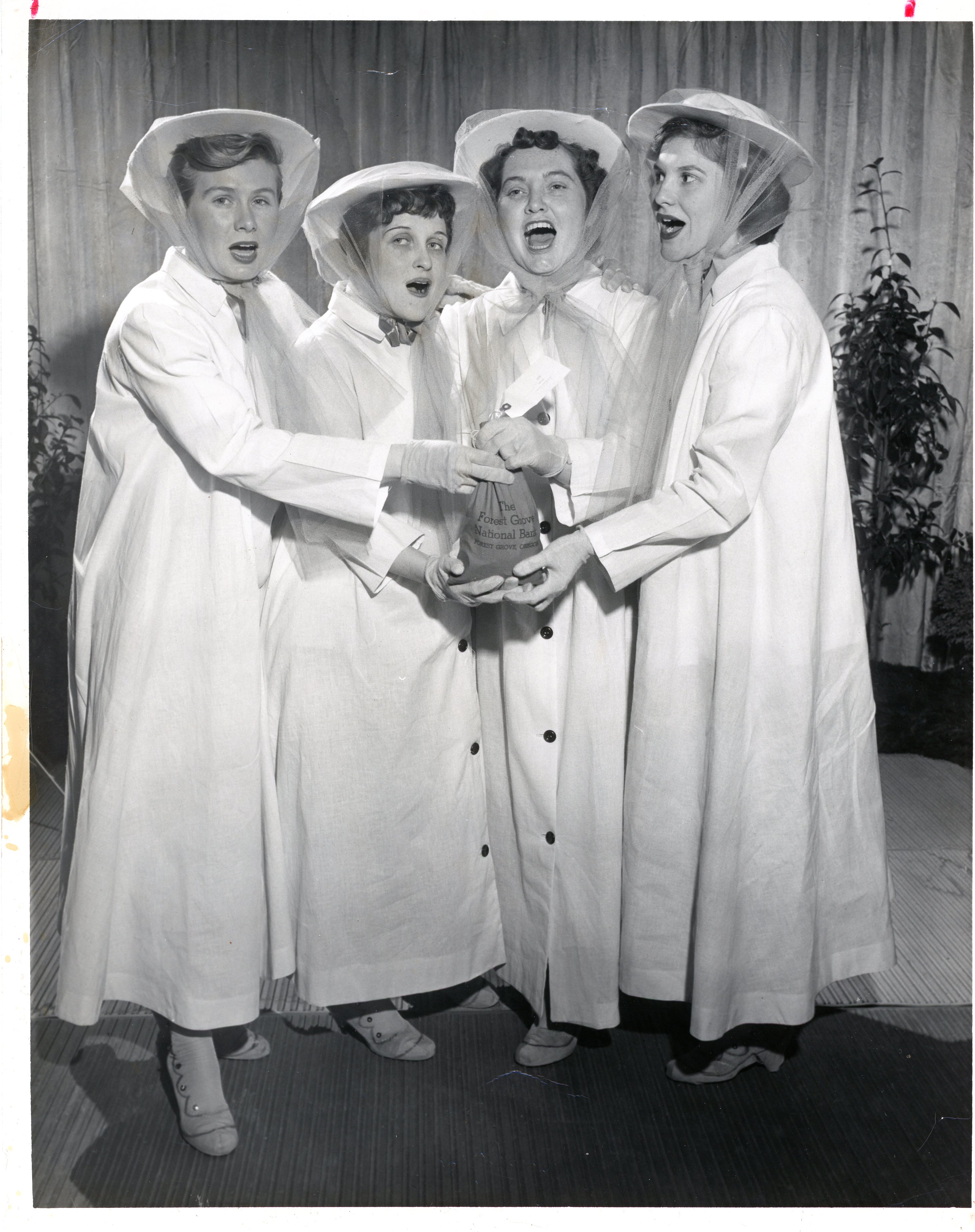A black and white photograph featuring the Pena Four from Lebanon, Oregon performing at the 1955 All-Northwest Barbershop Ballad Contest. The photographer is unknown, but it may have been Allan J. de Lay, a staff photographer for The Oregonian who took numerous photographs of the event over the years.