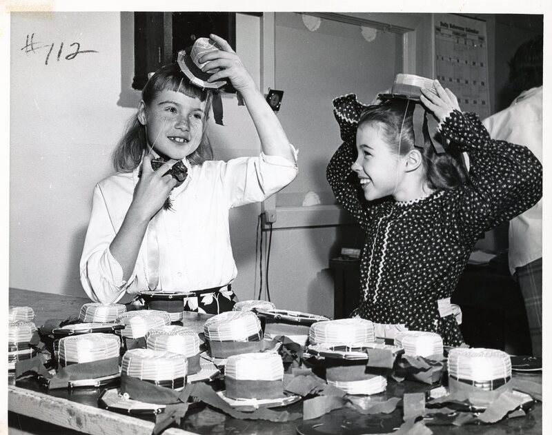 A black and white photograph featuring elementary school students trying on miniature, homemade, Gay Nineties-themed hats. The photographer is unknown, but it may have been Allan J. de Lay, a staff photographer for The Oregonian who took numerous photographs of the event over the years.