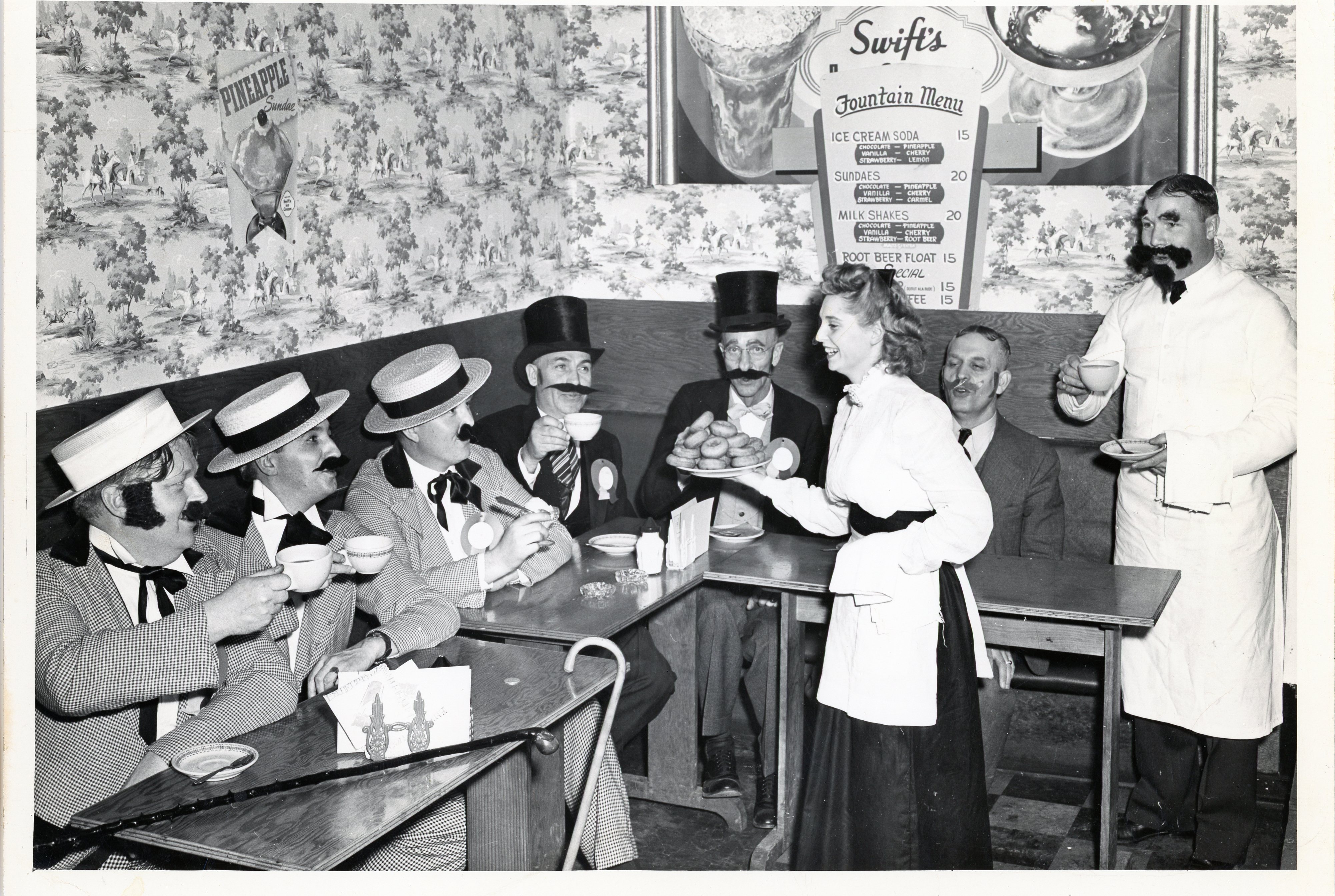 A black and white photograph featuring Lee Brattan serving donuts to barbershop quartets at Hundley's Donut Bar during the first annual Gay Nineties festival in 1947. Ray Hoss/ Hass is pictured at second left, and Mayor Hughes is pictured as the leftmost gentleman with a top hat. The photographer is unknown, but it may have been Allan J. de Lay, a staff photographer for The Oregonian who took numerous photographs of the event over the years.
