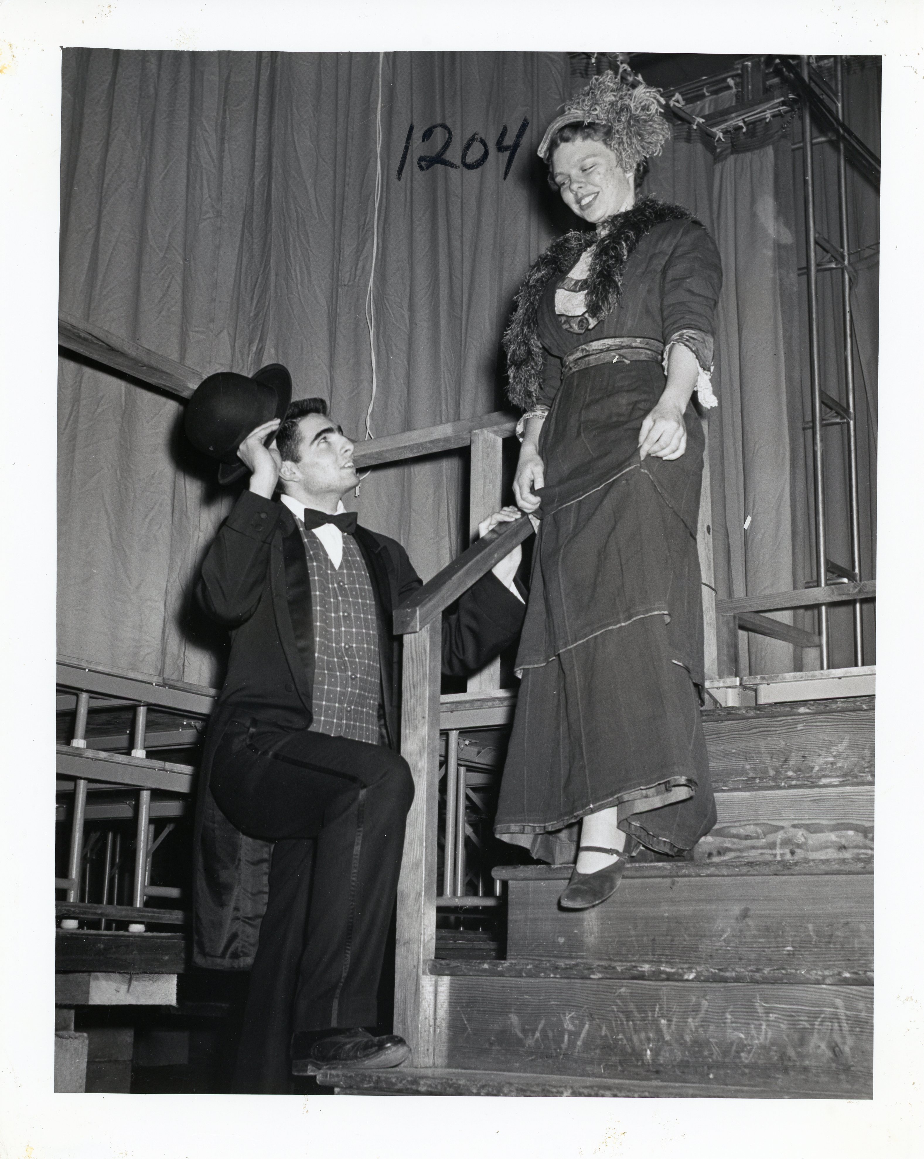 A black and white photograph taken during the Gay Nineties festival in the 1950s or 1960s featuring presumably a highschooler tipping his hat in the presence of a classmate. The photographer is unknown, but it may have been Allan J. de Lay, a staff photographer for The Oregonian who took numerous photographs of the event over the years.