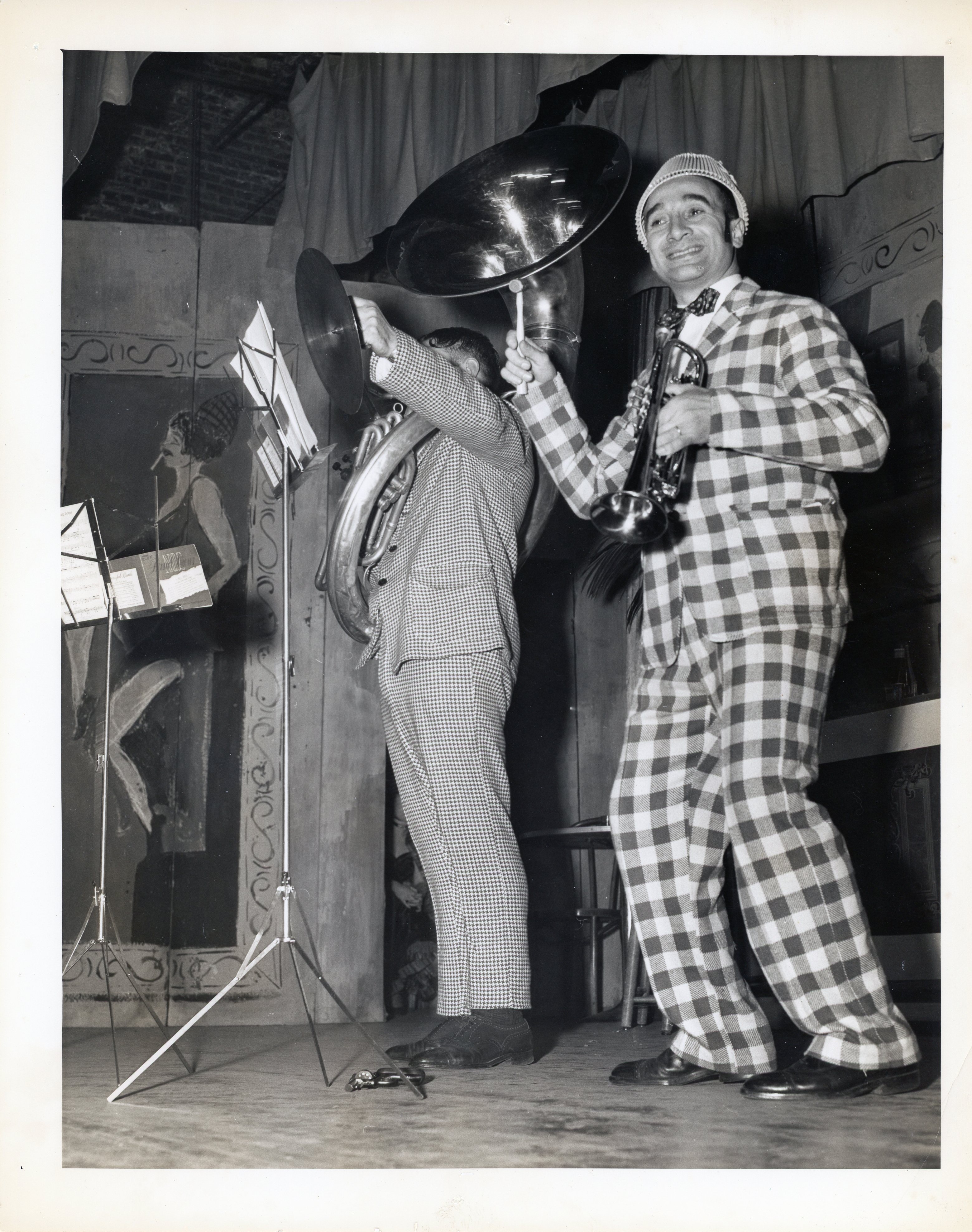 A black and white photograph featuring Big Tool and Little Tool, the 1956 Barbershop Ballad Contest's special guests. The photographer is unknown, but it may have been Allan J. de Lay, a staff photographer for The Oregonian who took numerous photographs of the event over the years.