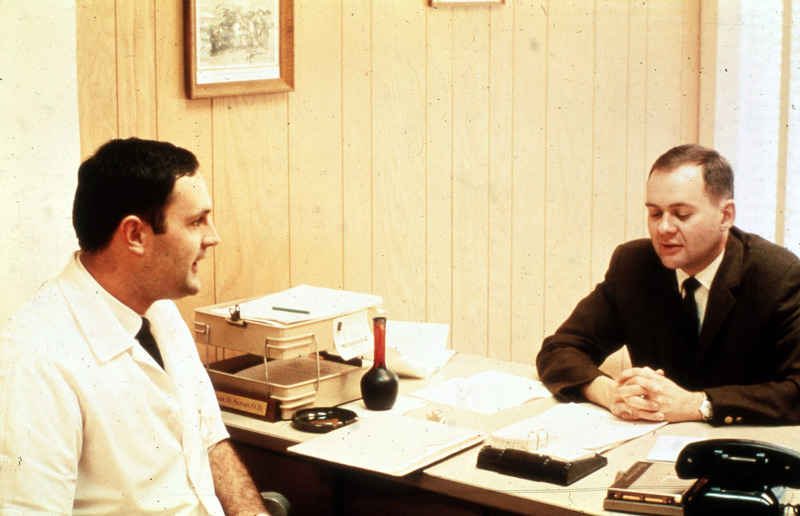 - Optometry professor Dr. Richard Septon of Pacific University, sitting at his desk circa 1968-1974. A man wearing a lab coat, possibly an Optometry student or another professor, sits in the foreground. Septon served as director of Pacific's Optometry Clinic at about this time.