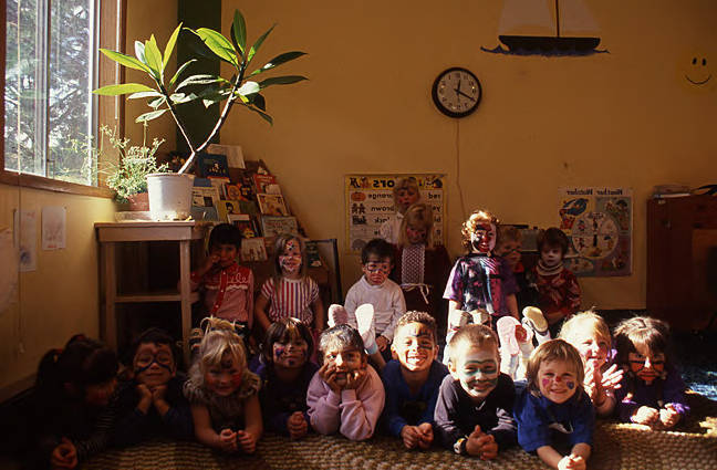 - A group of students with their faces painted pose for a photo in their Head Start classroom.