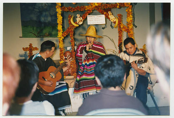 Community members singing and playing music in front of a Diá de Muertos, or Day of the Dead, shrine. Diá de Muertos is a Latin American celebration recognizing family members and ancestors that have passed away. It is observed on November 1st and 2nd, closely tied to Catholic observances of All Souls Day and All Saints Day. Marigold flowers are often used to decorate for the holiday.