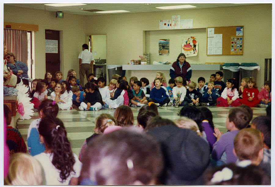 A large gathering of children, who are all sitting on the floor in a circle in the main hall of Centro Cultural.