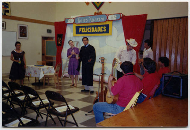 Community members putting on or perhaps rehearsing a play/performance. One character is dressed in a graduation gown under a banner that says congratulations in Spanish. Photographed inside Centro Cultural's main hall.