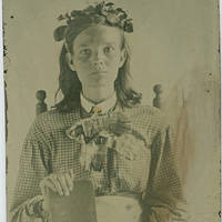 Black and white image of a young woman with shoulder-length hair. Her hair is pulled back from her face and held on top of her head with a printed ribbon tied into a bow with leaves and greenery included. She sits on a slat-backed chair, and one hand supports a book upright in her lap, which is covered by an apron tied at her waist. Her dress is gingham, with long sleeves, shoulders, and no corset; a white collar is fastened around the shirt collar and a large, plaid ribbon tied into a bow is affixed to it. There is also gold leaf painted at the conjunction of the white collar and ribbon.