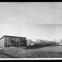 Black and white image of a square, two-story building with a sign reading 'Noblecraft Industries' on the front. A large semi is parked nearby. The trailer of the truck reads in part, 'Noblecraft. Kitchen cabinets -- Fixtures. Hillsboro, Oregon.' The factory stretches out away from the first building. The upper portion of the image has been obscured by a piece of paper, held on by a paperclip. This images was part of the Herbert McMullen bequest. McMullen was a local photographer who also collected other images of daily life in the area.