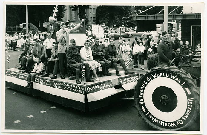 Photograph of a Veterans of World War I parade float, being pulled down the road by a tractor.