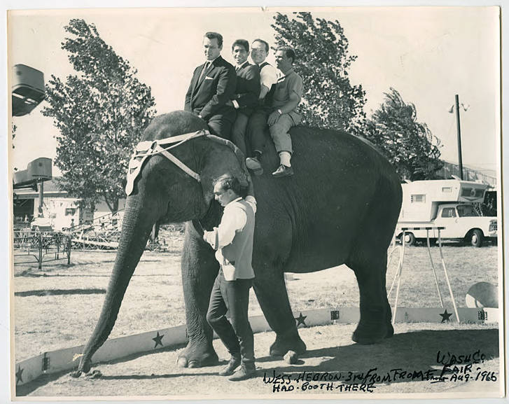 [front] Wash Co Fair; Wess Hebron - 3rd from from from Aug 1966 had booth there [back] [illegible name] Seattle - Hi [illegible name] - Wess Hebron Hillsboro + employee on elephant. Wash County Fair, Aug 1966; had hairstyling demonstration there [photographer's stamp] 1-7-1907 to 10-20-1986 My Friend Herbie SG