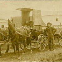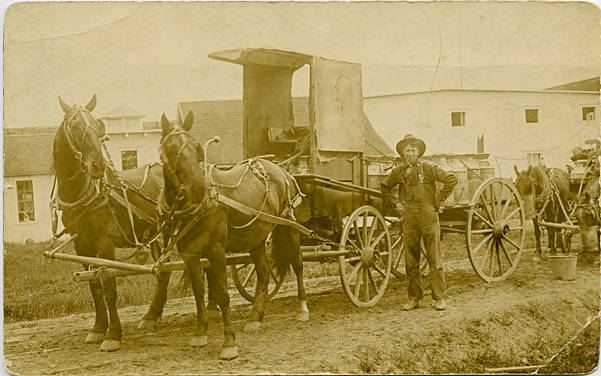 Sepia-toned image of a young man standing beside a wagon drawn by a two-horse team. The front is a covered seat, and the back is flat and filled with milk cans. Another wagon also loaded with milk cans stands behind the first. The road is dirt, and in the background is a large industrial building.