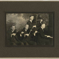 A photo of the Walker's Old Time Orchestra. From left to right: Samuel A. T. Walker on violin, Green Walker, Samuel's brother, on violin, unidentified young man on violin, and Charles L. Walker, Samuel's son, on piano.