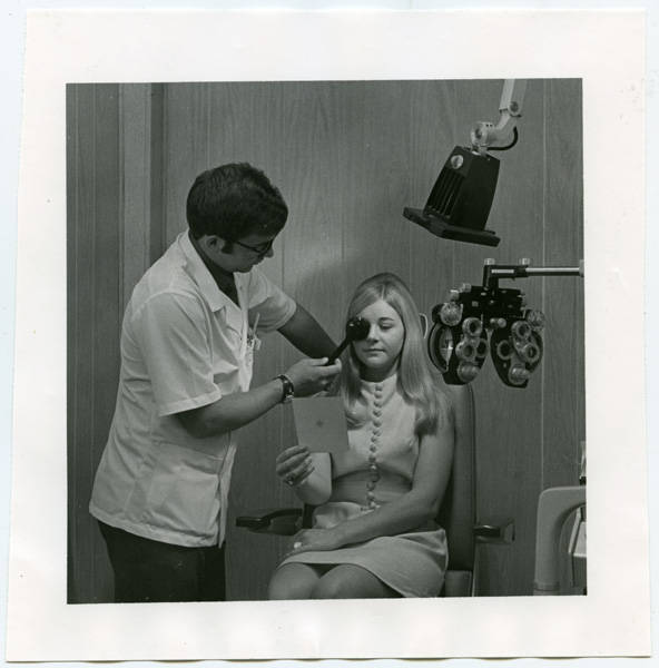 Photo of a female undergraduate student receiving an eye exam from a Pacific University optometry student.