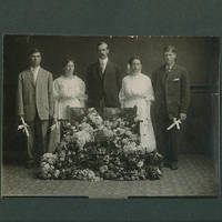 [back] graduation Class of Forest Grove High School; June 1909.; Orval Hutchins; Emma Morgan; Prof Wilkerson; Ava Carlile; Ray Devlin