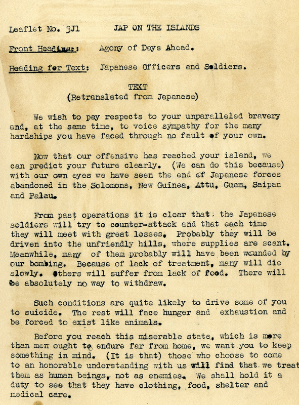 A propaganda leaflet issued by the Allied Forces during World War II, after the return of General Douglas MacArthur to the Philippine Islands in October, 1944. The leaflets were probably airdropped to Japanese troops on the Philippine Islands. It sympathizes with the Japanese troops, but warns of the upcoming hardships if they do not surrender. It explains that the Americans are humane in their treatment of those that surrender. The leaflet lays out the American victories, as a way to further persuade the Japanese to surrender. The intent of these leaflets was to demoralize Japanese troops by pointing out their weaknesses, with the hope of inducing their surrender. The leaflet is numbered '3J1'. The leaflet is accompanied by an official description and translation of the text into English. This is one item from a scrapbook of propaganda leaflets and related materials that was compiled by the Psychological Warfare Branch of the Allied Forces in the Southwest Pacific Area during World War II. The scrapbook belonged to Colonel Karl F. Baldwin of the United States Army, who helped establish the propaganda program. It contains approximately 200 pieces of propaganda, mostly in Japanese, that were intended for distribution in the Philippines, Japan, and other nearby areas.