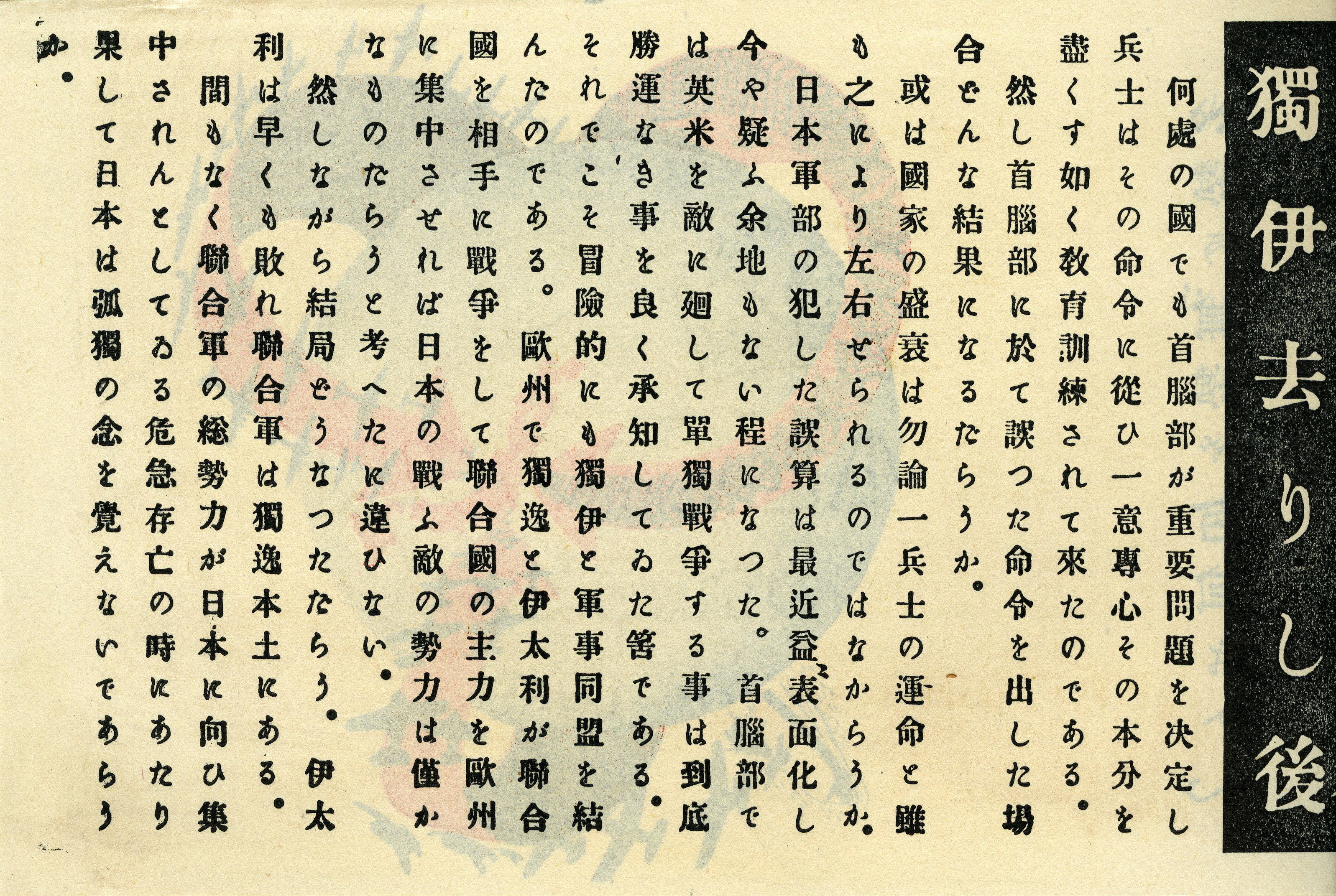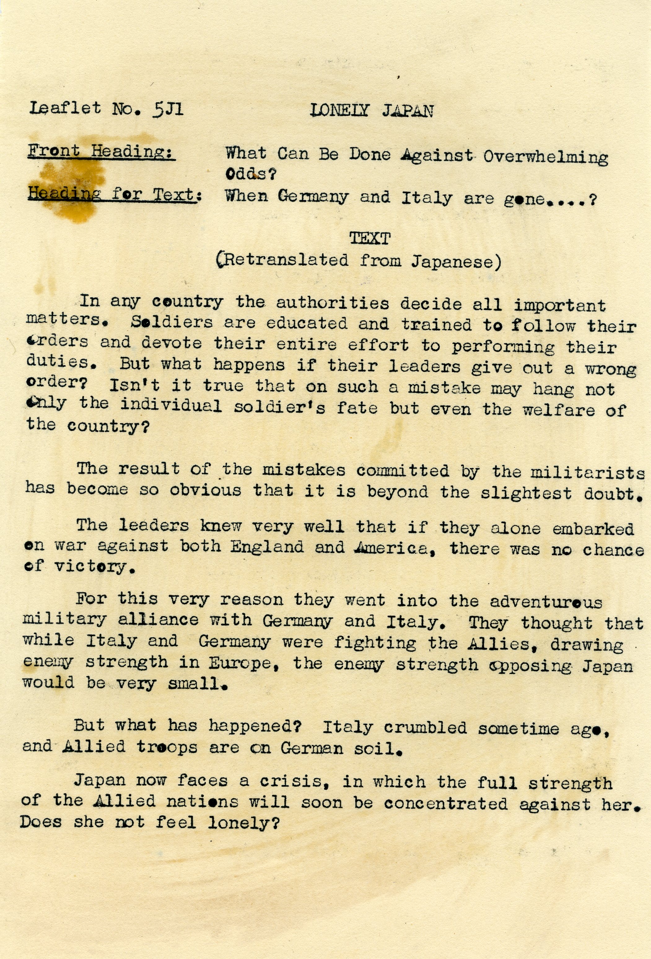 A propaganda leaflet issued by the Allied Forces during World War II after the return of General Douglas MacArthur to the Philippine Islands in 1944. The leaflets were probably airdropped to Japanese troops on the Philippine Islands soon after General MacArthur landed in October, 1944. The leaflet places the blame for Japanese involvement on the militarists, while stating that Japan is now alone in the fight. The leaflets were meant to demoralize Japanese troops by pointing out their weaknesses, with the hope of inducing their surrender. It is numbered '5J1'. The leaflet is accompanied by an official description and translation of the text into English. This is one item from a scrapbook of propaganda leaflets and related materials that was compiled by the Psychological Warfare Branch of the Allied Forces in the Southwest Pacific Area during World War II. The scrapbook belonged to Colonel Karl F. Baldwin of the United States Army, who helped establish the propaganda program. It contains approximately 200 pieces of propaganda, mostly in Japanese, that were intended for distribution in the Philippines, Japan, and other nearby areas.