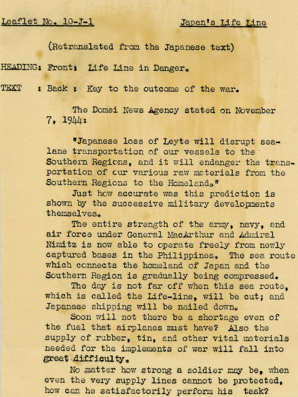 A propaganda leaflet issued by the Allied Forces during World War II after the return of General Douglas MacArthur to the Philippine Islands in 1944. The leaflets were probably airdropped to Japanese troops on the Philippine Islands soon after General MacArthur landed in October, 1944. It used an excerpt from the Domei News Agency about the importance of the Japanese supply line. The leaflet goes on to explain that the supply line is now in danger with General Douglas MacArthur and Admiral Chester Nimitz in command of Philippine bases. The intent of the leaflet was to demoralize Japanese troops by pointing out their weaknesses, with the hope of inducing their surrender. The leaflet is numbered '10J1'. It is accompanied by an official description and translation of the text into English. This is one item from a scrapbook of propaganda leaflets and related materials that was compiled by the Psychological Warfare Branch of the Allied Forces in the Southwest Pacific Area during World War II. The scrapbook belonged to Colonel Karl F. Baldwin of the United States Army, who helped establish the propaganda program. It contains approximately 200 pieces of propaganda, mostly in Japanese, that were intended for distribution in the Philippines, Japan, and other nearby areas.