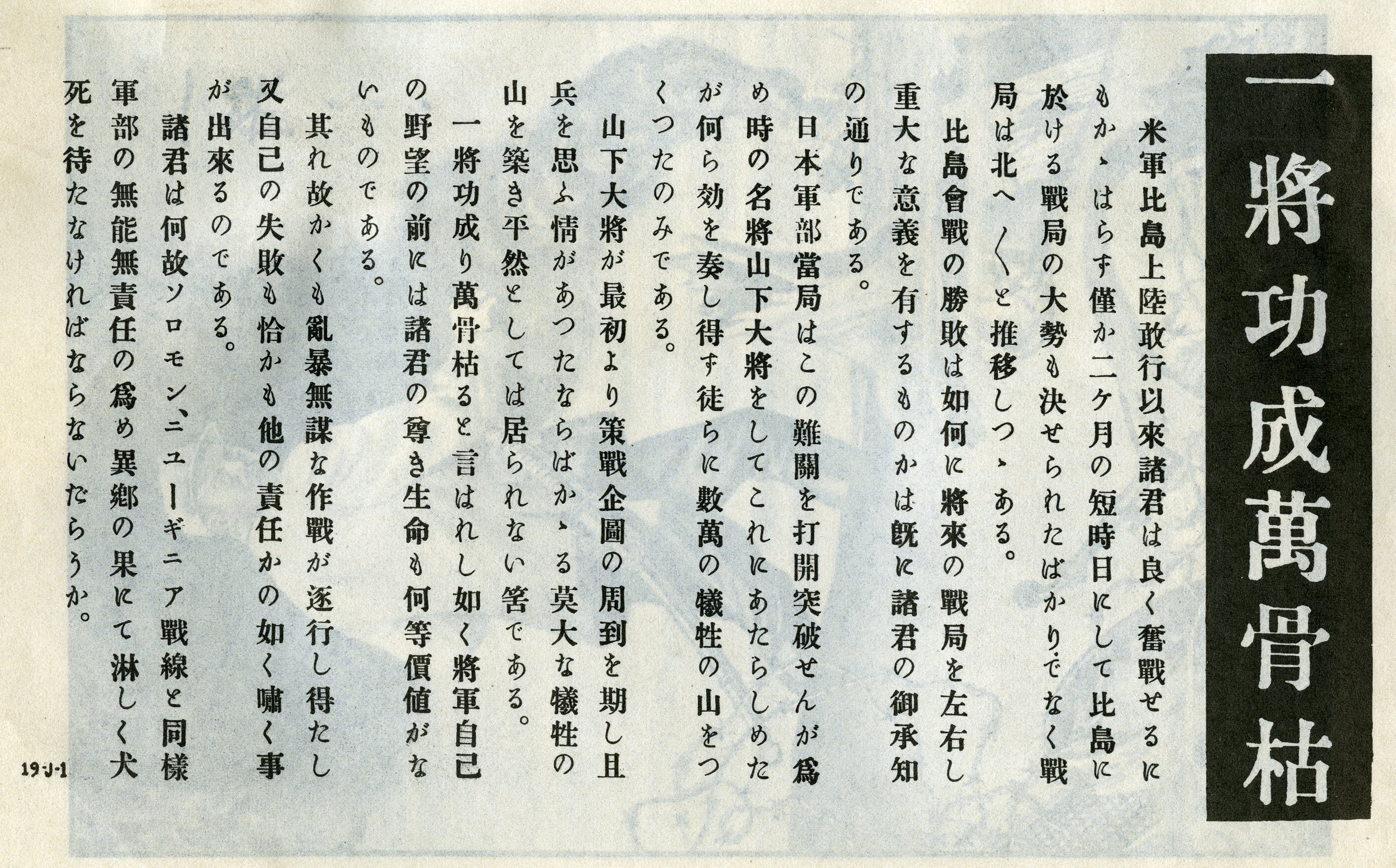 A propaganda leaflet issued by the Allied Forces during World War II after the return of General Douglas MacArthur to the Philippine Islands in 1944. The leaflets were probably airdropped to Japanese troops on the Philippine Islands soon after General MacArthur landed in October, 1944. One side features an image of Japanese General, Yamashita, walking away from a battlefield in defeat. The back side of the leaflet condemns General Yamashita for sacrificing so many Japanese troops. The leaflet is meant to drive a wedge between the Japanese troops and their military commanders with the hopes of inducing the surrender of Japanese troops. It is numbered '19J1'. It is accompanied by an official description and translation of the text into English. This is one item from a scrapbook of propaganda leaflets and related materials that was compiled by the Psychological Warfare Branch of the Allied Forces in the Southwest Pacific Area during World War II. The scrapbook belonged to Colonel Karl F. Baldwin of the United States Army, who helped establish the propaganda program. It contains approximately 200 pieces of propaganda, mostly in Japanese, that were intended for distribution in the Philippines, Japan, and other nearby areas.