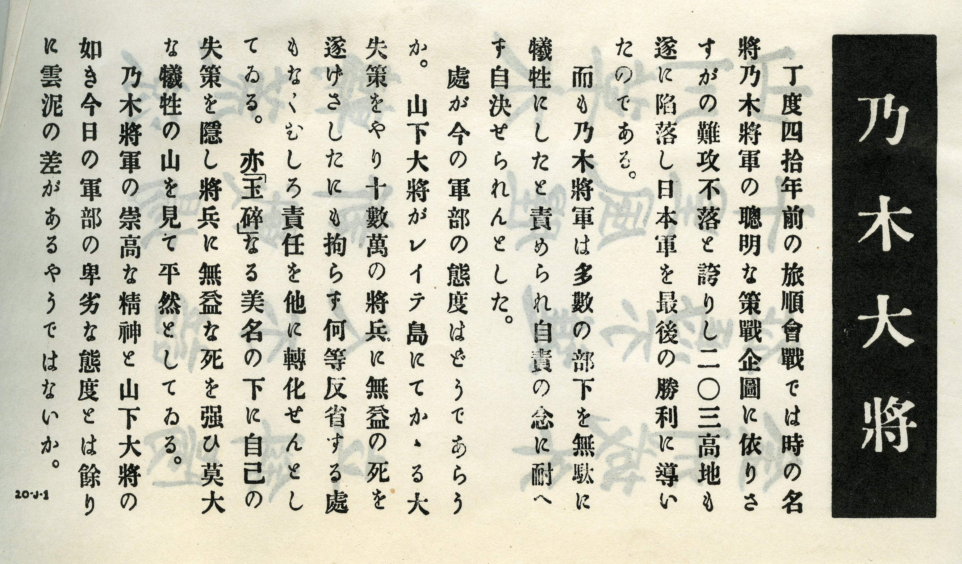 A propaganda leaflet issued by the Allied Forces during World War II after the return of General Douglas MacArthur to the Philippine Islands in 1944. The leaflets were probably airdropped to Japanese troops on the Philippine Islands soon after General MacArthur landed in October, 1944. One side features a poem written by Japanese General, Yamashita. The other side questions the Japanese military leaders, their responsibility for Japanese troops deaths and the lack of responsibility taken by General Yamashita. This leaflet was meant to drive a wedge between Japanese troops and their commanders with the hope of inducing the surrender of Japanese troops. It is numbered '20J1'. The leaflet is accompanied by an official description and translation of the text into English. This is one item from a scrapbook of propaganda leaflets and related materials that was compiled by the Psychological Warfare Branch of the Allied Forces in the Southwest Pacific Area during World War II. The scrapbook belonged to Colonel Karl F. Baldwin of the United States Army, who helped establish the propaganda program. It contains approximately 200 pieces of propaganda, mostly in Japanese, that were intended for distribution in the Philippines, Japan, and other nearby areas.