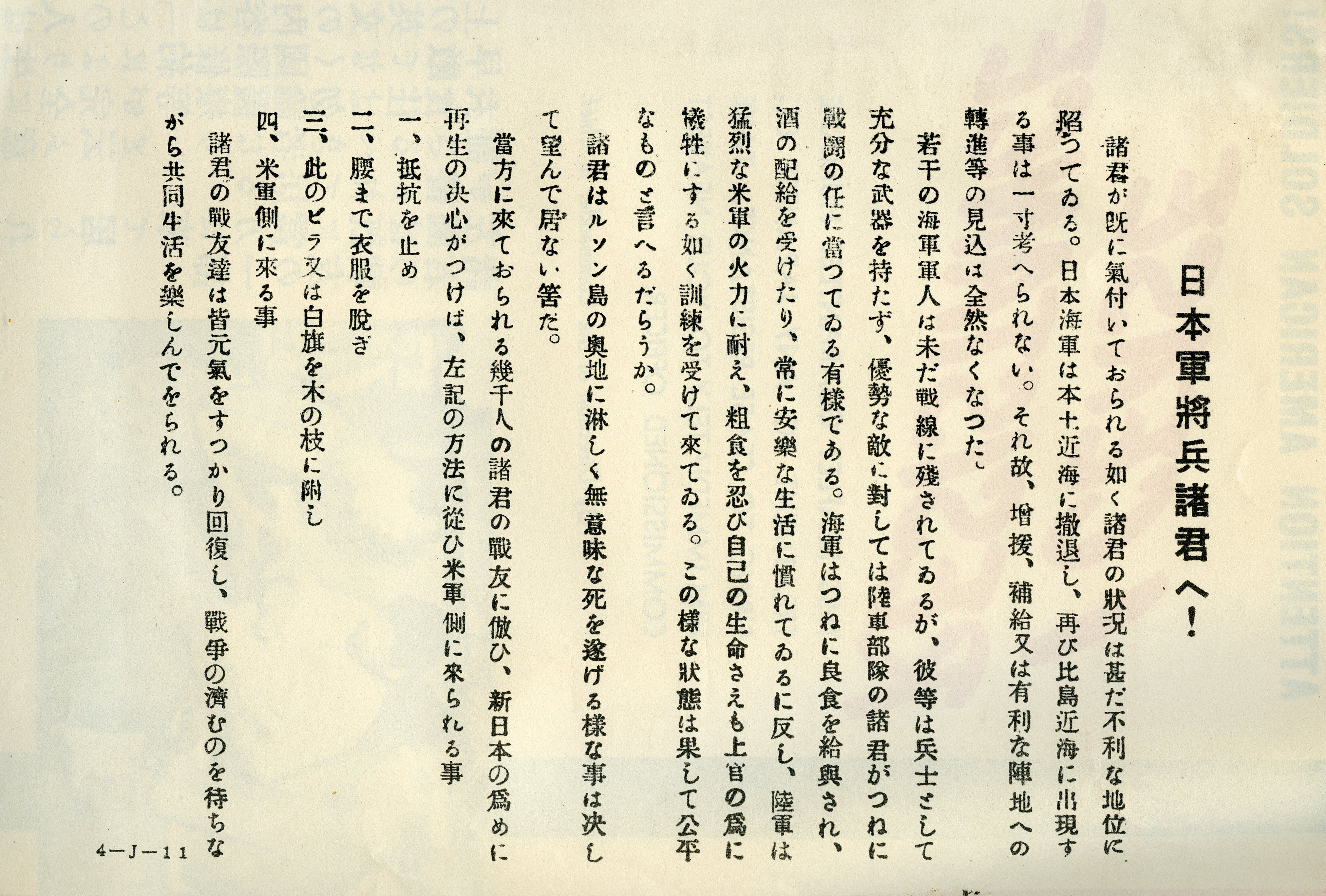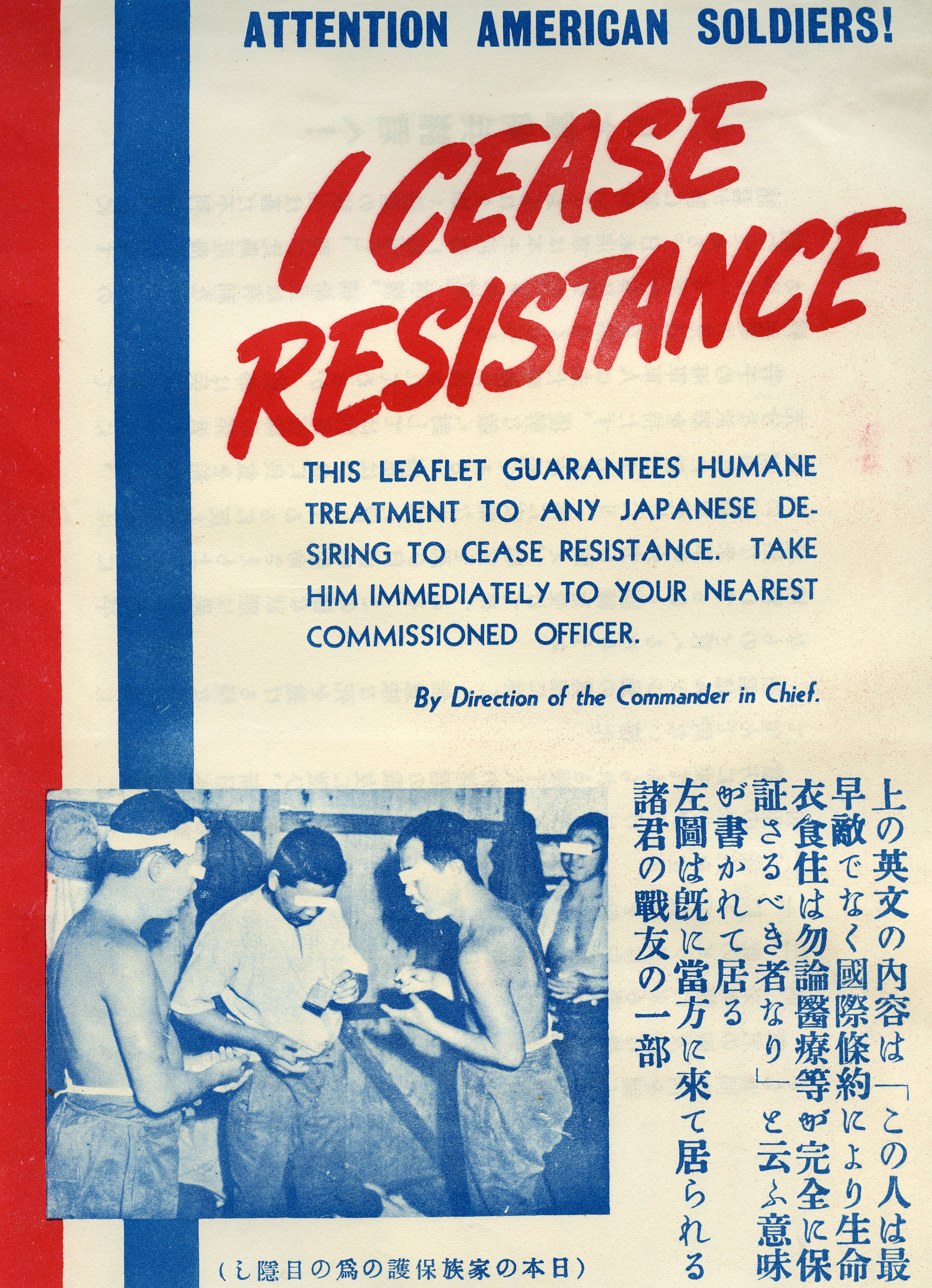 A propaganda leaflet issued by the Allied Forces during World War II after the return of General Douglas MacArthur to the Philippine Islands in 1944. It was probably airdropped to Japanese troops on the Philippine Islands soon after General MacArthur landed in October, 1944. One side features the words 'I Cease Resistance' with instructions for Japanese troops to present the leaflet to any American soldier for guaranteed humane treatment. The back of the leaflet addresses the Japanese army in the Luzon mountains that have been abandoned. It explains that no one is going to rescue them and their only way out is to surrender. This leaflet was intended to induce the surrender of Japanese troops by demoralizing them. It is numbered '1-J-11'. The leaflet is accompanied by an official description and translation of the text into English. This is one item from a scrapbook of propaganda leaflets and related materials that was compiled by the Psychological Warfare Branch of the Allied Forces in the Southwest Pacific Area during World War II. The scrapbook belonged to Colonel Karl F. Baldwin of the United States Army, who helped establish the propaganda program. It contains approximately 200 pieces of propaganda, mostly in Japanese, that were intended for distribution in the Philippines, Japan, and other nearby areas.
