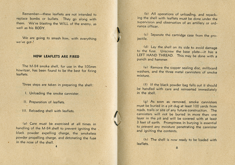 A booklet issued by the Allied Forces during World War II after the return of General Douglas MacArthur to the Philippine Islands in 1944. The booklet was printed for Americans and Filipinos troops, soon after General MacArthur landed in October, 1944. It explains how propaganda works and why it is important. The booklet also explains how to properly load the leaflets in shells, in preparation for them to be fired. This is one item from a scrapbook of propaganda leaflets and related materials that was compiled by the Psychological Warfare Branch of the Allied Forces in the Southwest Pacific Area during World War II. The scrapbook belonged to Colonel Karl F. Baldwin of the United States Army, who helped establish the propaganda program. It contains approximately 200 pieces of propaganda, mostly in Japanese, that were intended for distribution in the Philippines, Japan, and other nearby areas.