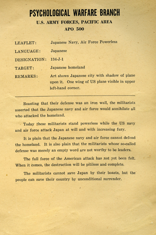 A propaganda leaflet issued by the Allied Forces during World War II. The leaflets were most likely dropped to Japanese troops and citizens in Japan in 1945. One side features an illustration of a Japanese city from the air, with one wing of a US plane visible in the upper left-hand corner. The other side states that the Japanese militarists are responsible for the war and that the American victory is imminent. The leaflets were intended to lower Japanese morale. The leaflet is number '134-J-1'. It is accompanied by an official description and translation of the text into English. This is one item from a scrapbook of propaganda leaflets and related materials that was compiled by the Psychological Warfare Branch of the Allied Forces in the Southwest Pacific Area during World War II. The scrapbook belonged to Colonel Karl F. Baldwin of the United States Army, who helped establish the propaganda program. It contains approximately 200 pieces of propaganda, mostly in Japanese, that were intended for distribution in the Philippines, Japan, and other nearby areas.