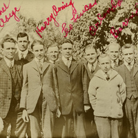A group photograph of male students at Pacific University in 1917. The caption with the photograph identifies the students as Hershel Obye, Harry Romig, Noah Jones, Leo Lucas, Thomas Fowler, Orlando Romig, Samuel Stanley and Ralph Jones. It was probably taken around the time the United States entered World War I in April, 1917. Most male students of Pacific University enlisted in the military during World War I. This picture appears in an album that was compiled by Greta McIntyre Sheeley, a 1920 Pacific University graduate.