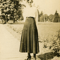 A photograph of a female Pacific University student standing on a wood plank walkway on campus 1916. The caption on the photograph identifying the student as Greta McIntyre Sheeley. This picture appears in an album that was compiled by Greta McIntyre Sheeley, a 1920 Pacific University graduate.