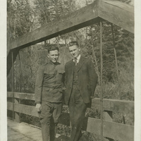 A photograph of two male Pacific University students standing on a bridge in 1918, one appears to be wearing a military uniform. The caption with the photograph identifies the students as Ralph Jones and Hershell Obye. The photograph was taken during World War I. Many of the male students at Pacific University enlisted in the military during this time. This picture appears in an album that was compiled by Greta McIntyre Sheeley, a 1920 Pacific University graduate.