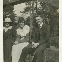 A photograph of three Pacific University students sitting on the rail of a bridge in 1918. The caption identifies the students as Greta McIntyre Sheeley, Gertrude Porter and Hershel Obye. The photograph was taken during World War I. Many of the male students at Pacific University enlisted in the military at this time. This picture appears in an album that was compiled by Greta McIntyre Sheeley, a 1920 Pacific University graduate.