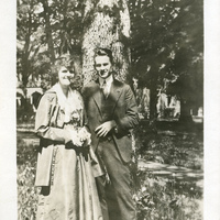 A photograph of two Pacific University students that appear to be a couple, standing on campus in front of a large oak tree. The caption identifies the students as Gertrude Porter and Hershel Obye. This picture appears in an album that was compiled by Greta McIntyre Sheeley, a 1920 Pacific University graduate.
