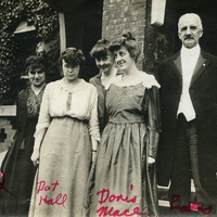 A photograph of Henry Liberty Bates and Mary Frances Farnham posing with students outside second Herrick Hall in 1916. Henry Liberty Bates was a beloved professor at Pacific University where he taught Education and Philosophy. He served as the last principal of the Tualatin Academy before it closed in 1915. Mary Frances Farnham served as principal of the Ladies Department for the Tualatin Academy from 1897 until it closed in 1915. She went on to serve as the dean of women students at Pacific University for nine additional years. Herrick Hall was built in 1907 after its predecessor burned down. In 1920 it served as the girl's dormitory. This picture appears in an album that was compiled by Greta McIntyre Sheeley, a 1920 Pacific University graduate.