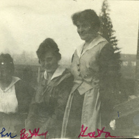 A photograph of three female students from Pacific University posing in front of second Herrick Hall in 1916. The caption with the photograph identifies the students as Dorothy Hall, Beth Crandall and Greta McIntyre Sheeley. Herrick Hall was the second women's dormitory on the Pacific University campus. It was built in 1907 after it's predecessor burned down. This picture appears in an album that was compiled by Greta McIntyre Sheeley, a 1920 Pacific University graduate.