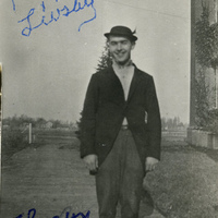 A photograph of a Pacific University student dressed up for Clean-Up Day in 1917. The student is wearing a bowler type hat and tails. The caption with the photograph identifies the student as Thayne Livesay. Clean-Up Day was a long-held tradition at Pacific University. One day a year in late fall, students and staff would gather at Marsh Hall before repairing and beautifying the campus. Students would often dress as hobos, farmers or cross-dress. This picture appears in an album that was compiled by Greta McIntyre Sheeley, a 1920 Pacific University graduate.