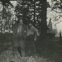 A photograph of two male Pacific University students that are dressed up for Clean-up Day in 1917. One student is dressed in women's clothing. They are standing in the leaves, while others are cleaning up in the background. Clean-Up Day was a long-held tradition at Pacific University. One day a year in late fall, students and staff would gather at Marsh Hall before repairing and beautifying the campus. Students would often dress as hobos, farmers or cross-dress. This picture appears in an album that was compiled by Greta McIntyre Sheeley, a 1920 Pacific University graduate.