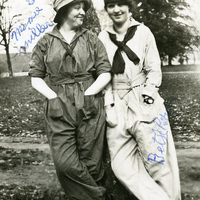 A photograph of two female Pacific University students dressed like men for Clean-Up day in 1917. The caption of the photograph identifies them as Beth Potwin and Mamie Loomis. Clean-Up Day was a long-held tradition at Pacific University. One day a year in late fall, students and staff would gather at Marsh Hall before repairing and beautifying the campus. Students would often dress as hobos, farmers or cross-dress. This picture appears in an album that was compiled by Greta McIntyre Sheeley, a 1920 Pacific University graduate.